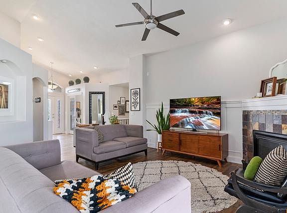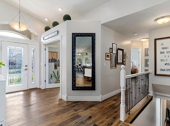 Beautiful rambler features a bright and open floorplan with vaulted ceilings, gorgeous hardwood, custom trim work throughout, open kitchen with large island and stainless steel appliances, gas fireplace on each level, big master suite with large walk-in closet, separate jetted tub/shower in the bathroom and has direct access to the backyard, 3-tone paint, fully finished basement with custom built-ins in the family room, double vanity in the bathroom, exercise room, and a guest suite with private bathroom, and a fully fenced backyard with a big covered patio and beautiful landscaping. 3rd bedroom upstairs is currently being used as an office. Sq. footage per tax data records; Buyer to verify all information.