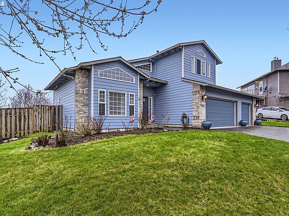 Start everyday with a view of Mt Hood on the deck outside your upstairs bedroom, as well as from the kitchen! This three-bedroom house is located on a secluded cul-de-sac in the Stuart Ridge neighborhood a short distance from the greenspace and nature pond. Inside the house the first floor has vaulted ceilings facing the north, while the kitchen and dining room face south with a view of Mt Hood. All bedrooms are upstairs, with the primary bathroom shower ready for you to finish to your taste! The three-car garage has a separate 3rd bay, perhaps for projects or crafts? House updates include a newer roof and furnace, and replacement Hardi-Plank siding in 2007 with recent exterior paint. Sprinklers help keep the grass green well into the summer months! Chicken coop can be left or removed.