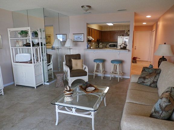 Elegant, Beauty + comfort speaks luxury on this Lagoon Front Condo. Tile throughout this spacious 2/2 with many upgrades. Not a rental. Large kitchen with beautiful tiled counter tops and back slash. Wine cooler, New solid wood doors, freshly painted. Custom Drapes and window treatments, Plantation Shutters in Master. Beautiful furnishings, new patio furniture, sofa bed with sheets, Easy to Show!