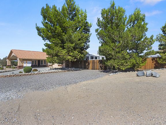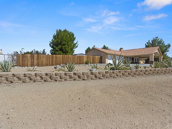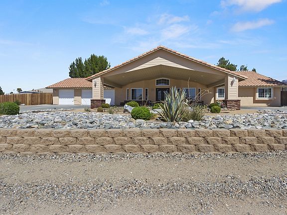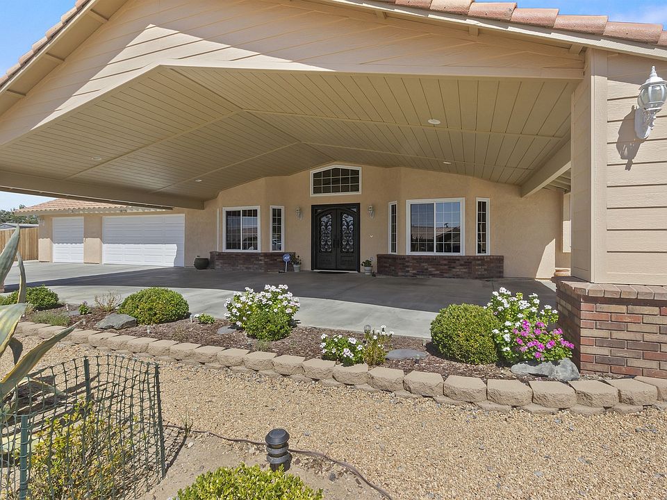 Located in the highly desired community of Upper Desert Knolls Manor, this beautiful home is situated on three quarters of an acre and features 4 bedrooms, 2.5 baths, great curb appeal, fresh exterior paint, an exquisite iron double-entry door, circular driveway, low maintenance desert landscaping, 3-car garage, gated RV storage, and plenty of room for recreational toys. This single-story home has a light and bright open floor plan enhanced by French doors and dual pane windows. A tile entry paves the way to laminate floors throughout, baseboards and neutral colored interior paint. The kitchen has ample counter and storage space, a walk-in pantry, center island with free standing range, garden window and wet bar. Enjoy the bay window located in the dining room which opens to the family room with vaulted ceilings, a ceiling fan, custom river rock gas fireplace and upgraded powder room. All 4 bedrooms have been upgraded with mirrored wardrobe doors and include ceiling fans. The full bath has been remodeled to include a dual vanity, a combination tub and shower, and tiled floors. The master bedroom is a personal retreat with an en-suite bathroom, over-sized walk-in shower and closet, dual his/her vanities with self-closing drawers and doors. French Doors lead you out of the master bedroom to a private, large and well-maintained backyard with tree lined fence, planters, fire-pit and a walk around patio cover to enjoy the serene peacefulness at the days end.