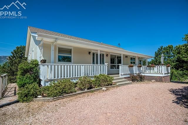 Custom ranch style home on 1.32 acres with a large front porch, a large back deck with mountain and Pikes Peak views, a lower walk out deck from the family room, circular drive way, 2 car garage RV parking area,on a very private lot! Walk into the home and you will notice how bright and open the floor plan is. In the living room there is a wet bar area for when you entertain. In the kitchen, there is an island with granite slab, newer Bosch dishwasher, and Jenn-Air range The master bedroom has an attached 5 piece bath with a jetted tub and French doors leading out to the upper deck. The downstairs could be a mother-in-law suite as it has a separate entrance, bedrooms a bathroom and a kitchen. Great home, great location, close to shopping, fire station, schools and restaurants! All appliances stay including the washer and dryer!