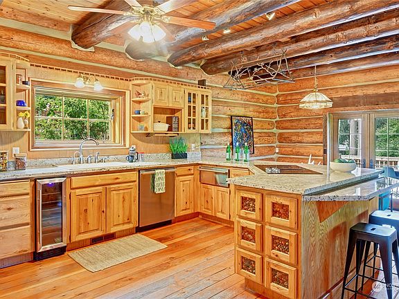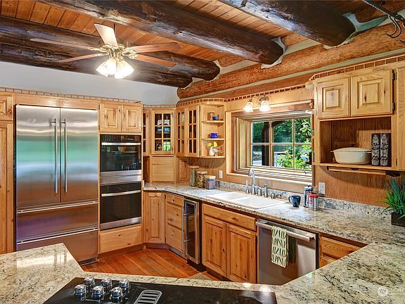 Set on over 5 acres of private grounds, this gated estate offers the space & amenities you’ve dreamed of. The hand-crafted log lodge will enchant you with warm timber finishes, fresh paint/carpeting & all new windows. Gather alongside scenic views in the great room with open living & dining areas flowing to a granite/stainless kitchen with new double ovens. 3 vaulted bedrooms await you upstairs, including your mountain view owner’s suite. A huge rec room with remodeled 2nd kitchen + guest apartment with 3rd kitchen offer ideal flex space. Enjoy the serene setting from the wrap-around porch or patio with fire pit. Don’t miss the huge 6-car garage, tree house, new garden beds, & new chicken coops, too! Just minutes to Redmond or Woodinville.