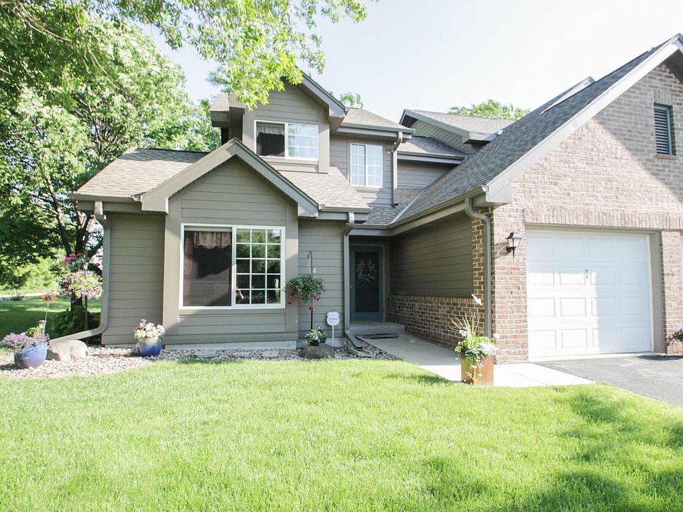 Rare opportunity to own this 3 BR, 2 full BA end unit!This unit is over 1,500 sq ft & has many updates.Spacious Liv Rm offers corner gas FP w/newer insert & sliding doors open to private patio w/southern exposure & overlooks adjacent green space.1st floor includes BR (w/newer flooring) & BEAUTIFULLY updated full BA w/tile.KIT has pass thru to dinette w/vaulted ceiling.The 2nd floor includes vaulted ceilings & large master suite w/walk in closet & 3rd BR.Furnace & water heater about 6 yrs old.Building has newer siding, roof & downspouts (approx 4-5 yrs old). Pull down storage in attached garage