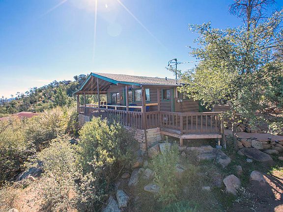 Very nice cabin getaway from Phoenix, or full time living! A quick 10 minute drive from the historic Prescott Square/Courthouse and Whiskey Row. Newer pump, plumbing and tank on well. New upgrades include partial roof with rain gutters, new propane fireplace, new ceiling fans and light fixtures, and new slider doors and deck off sitting room. Granite counter tops in kitchen with walkout deck. Cabin is situated on a mountain with spectacular panoramic views of the Flagstaff San Francisco peaks, Glassford Hill, Granite Mountain, Mingus Mountain, and National Forest land. Over an acre of land, with boulders, beautifully pruned and maintained landscaping and walking trails, with privacy, and a private road with no traffic. This is a ''MUST SEE'' cabin you've been looking for! Sold as is