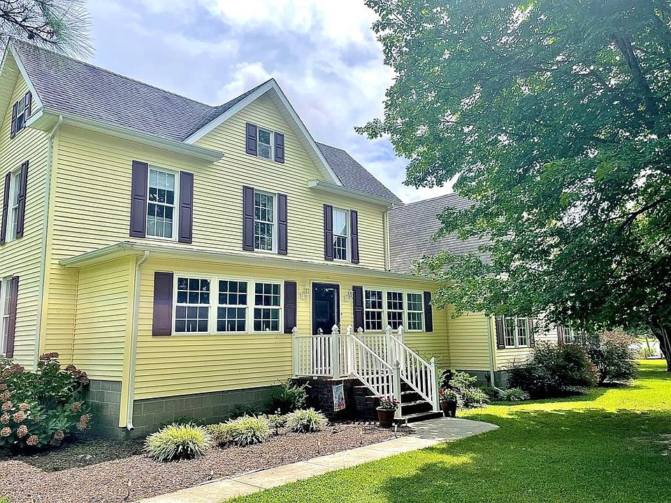 The best of both worlds with this home, Hunting Creek waterfront view & surrounded by mature trees with lots of green landscape view! Enclosed front porch for water view dining & relaxing. Dining room opens up to kitchen with island & tile flooring. Step into the family room with fireplace, vaulted ceiling, wet bar & water view. Primary En Suite is spacious, tile flooring & walls in bath with jetted tub, 2 walk in closets and leads out to rear open deck. Laundry room, full & half bath complete the first level. 2nd level offers two bedrooms & home office. Charming garden area & large open deck. The sunsets on the horizon over the creek are idyllic! Two docks need some love. Large out building with roll up door. Johnsons Wharf Boat Launch adjacent to property! Dual Zoned. Renovations 2015.