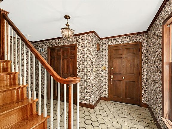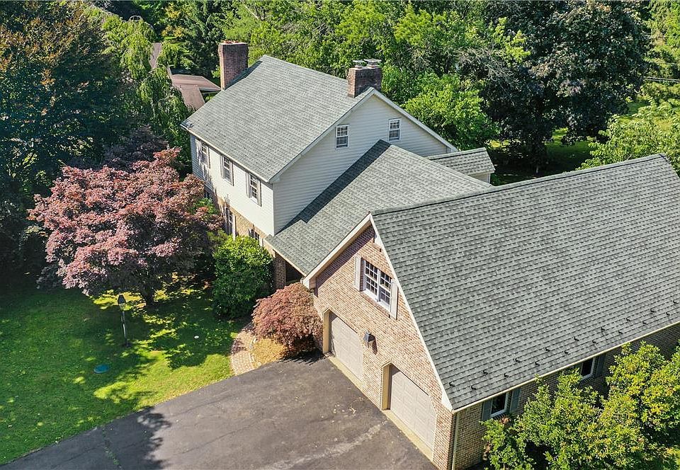 Boasting over 2800 square feet, the first floor offers a formal living room with a fireplace trimmed in Moravian tile, as well as a formal dining room. The large kitchen with breakfast area includes a walk-in pantry and peninsula with seating. A floor-to-ceiling brick fireplace is the focal point of the living room, while a bedroom and full bath nearby offer options for guests or extended family. The large sunroom with two walls of windows looks out over the flagstone patio and green lawn beyond. Upstairs, the primary suite has dual closets, and shares a bath with two additional bedrooms. An exercise room and two unfinished spaces stand ready to be turned into any type of space you require.
