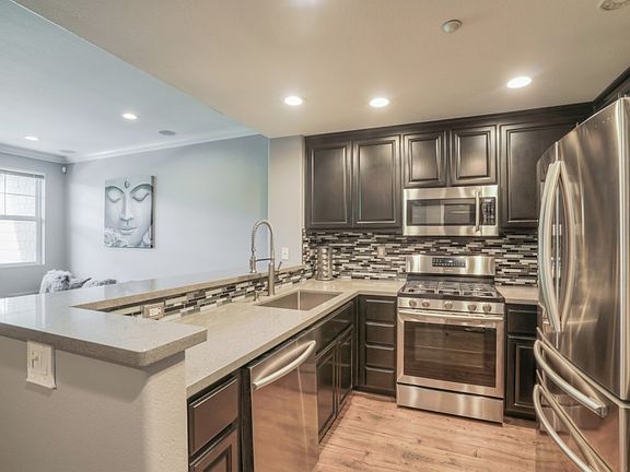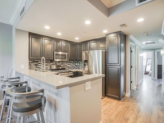 Impeccably updated executive condo in the heart of downtown Livermore. Close proximity to restaurants and night life. Kitchen has been completely reimagined with a Zuhne stainless steel undermount sink, GE stainless steel appliances, Samsung 4-door french refrigerator in stainless steel with flex zone drawer, quartz counters and multi-color gray tile backsplash. Bathrooms have been completely redone with a elegant look including slate finishes and touchless Kohler commodes. Room in laundry for large full size washer and dryer. Large interior storage closet. Two car tandem garage with interior access and extra gracious storage room.