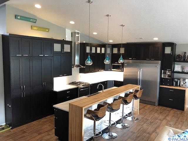 This is such a cool home with quite the WOW factor as you walk into a designated entry with cool built-ins and custom lighting, then continue into the wide-open great room with soaring vaulted ceilings and dream kitchen with quartz counters, high-end appliances, and a pinterest-style hidden walk-in pantry. The floor plan is a split-bedroom design, with a large master, big enough for a lounge area, and large master bath with gorgeous tiled walk-in shower. Master closet has lots of built-ins, and laundry room connected. The other two bedrooms also have walk-in closets, and the 4th bedroom or office is a good sized room as well. All bathrooms have custom butcher block counters to match the kitchen bar, and pretty tile flooring. Back in the kitchen, there's a coffee bar area as well as tons of counter space. The large apron composite kitchen sink looks out to the wall to wall windows taking advantage of that indoor/outdoor lifestyle, and looking out to the backyard with a giant covered patio and gorgeous landscaping, including a custom-built shed that matches the house, a little raised garden, and a separate, gated, dog run along the side of the home. Other cool features, are boat/RV parking on the side, extra-large driveway, water circulation system, wired for hot tub, wired for tv on back patio, outdoor Bose speakers, and indoor surround sound. This is not a cookie-cutter home in the least, with cool design and a unique floor plan with lots of character! Come check it out! About the neighborhood, I truly don't think you could find a better location or better neighbors! There's a neighborhood facebook site for everybody to stay connected. Not only are the neighbors fantastic, but there's Badger Mountain Elementary school within about a three minute walk, and badger Mountain Park within about a three minute walk, including a splash pad, dog park, and sports fields. You can also walk to Dutch Brothers for coffee and Yokes Grocery Store as well as several shops and restaurants in about five minutes. There's quick access to your choice of trails/paths within about two minutes! Absolutely fantastic location and neighborhood!