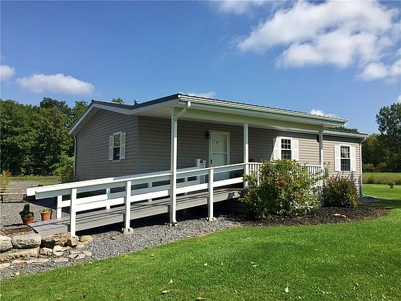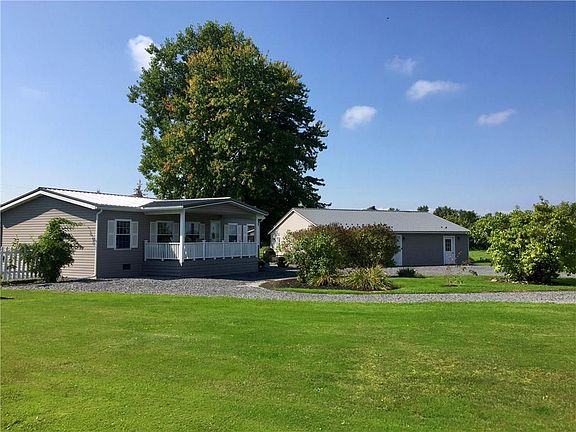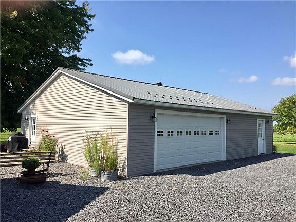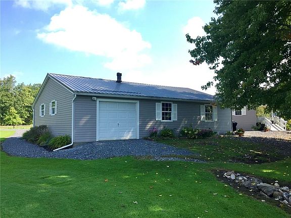 Completely updated 3 bed 2 full bath ranch and insulated 32x40 garage with 220amp electric & multiple overhead doors set on over 10 1/2 level acres with landscaped grounds. Recent updates include vinyl siding and metal roofs on both house and garage, vinyl replacement window & doors, wide plank pine flooring throughout, large covered decks on both the front and back of the house, stone driveway with turnaround, invisible pet fence system and more. The level 10 1/2 acre property features a spring fed pond, heirloom apple trees, and tillable land with one field already producing Timothy/clover hay (45-50 round bails per year). Centrally located between Seneca and Cayuga lakes, the property features 846ft of road frontage on W Blaine Rd & 566ft on Kinnie Rd, offering a lot of opportunity.