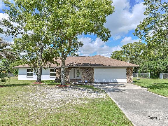 Active Under Contract. Nestled on 1.16 acres this home gives you plenty of room to spread out. Located on a dead-end road for privacy and zoned AR so a horse is welcome. Stonework on the front of the home and a covered front porch adds to the curb appeal. Inside the home the living space just keeps going. Tile flooring flows throughout the home for easy maintenance. A fresh coat of paint inside and outside and the a/c unit is from 2020. A formal living room large enough for everyone to gather flows into the family room which is fitted with a stonework fireplace. The kitchen is updated and offer ample granite counter space, plenty of wood cabinets, a breakfast bar, stainless steel appliances, and a pantry. The dining room area is right outside for serving convenience. A pocket door separates the guest bedrooms from the rest of the home. Both guest bedrooms are a great size with plenty of closet space. A guest bathroom is right outside the hallway for convenience. The desirable split floorplan gives the master bedroom some privacy. The master bedroom massive with a vanity area and a private bath attached. The master bath provides dual sinks and a walk-in shower. Through the French doors you will find a Florida room equipped with sliding windows to let breeze in and listen to the sweet sounds of nature. The lanai area is large enough to accommodate the whole family for a day of lounging in the pool or watch the kids and pet play outback. Start living on this beautiful piece of country side today!