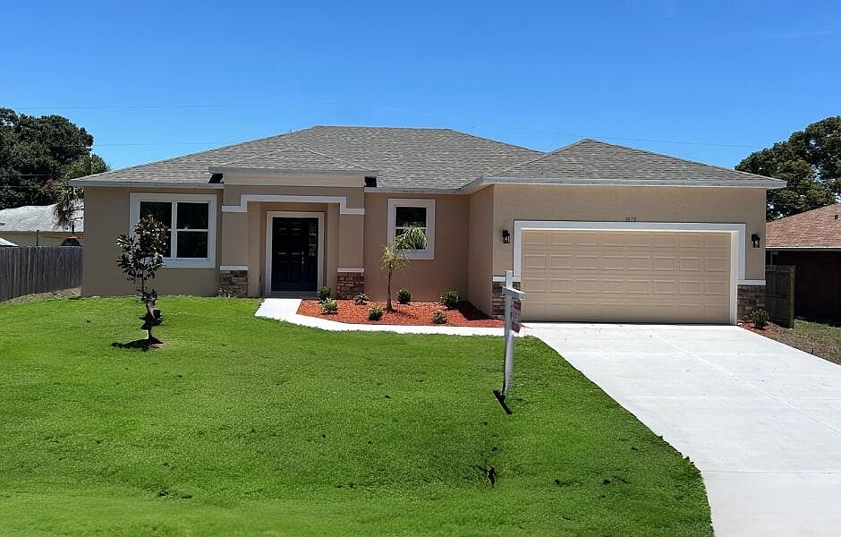 Stunning, custom-built home in NE Palm Bay, featuring tray ceilings & soft-touch cabinetry throughout, creating an atmosphere of elegance & comfort. Open floor plan seamlessly connects kitchen to family room, both of which overlook roomy backyard patio, perfect for entertaining or relaxing.