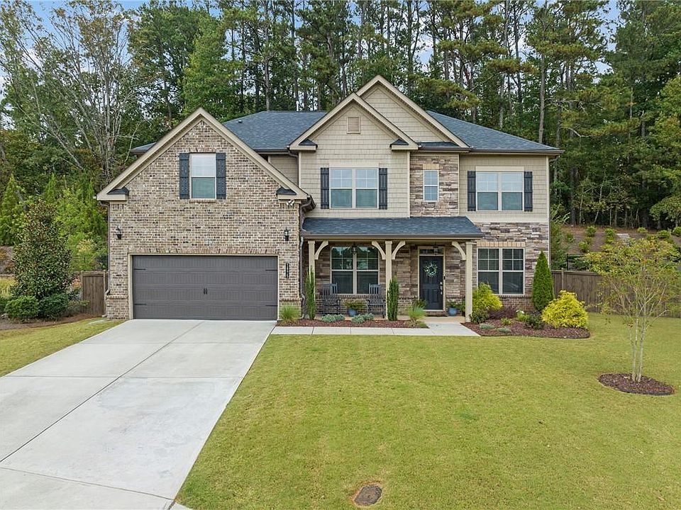 Meticulously maintained home located in the highly sought after Landing at Kelly Mill Subdivision featuring a plethora of modern upgrades: high quality LVP flooring, tile in the bathrooms, extra Cat6 cables installed throughout the home, hall tree with cubbies located in the mudroom, excellent storage space and workshop cabinetry and counters in the garage, along with plenty of other design center upgrades and finishes throughout the home as well. Cozy rocking chair front porch leads to a two-story foyer with designated office space on the right and large separate dining room on the left which features wainscoting, crown moulding, coffered ceilings, and a butler’s pantry. Beautiful kitchen with white cabinets, granite counters, stainless steel appliances and large island overlooks the two-story great room with cozy stacked stone fireplace. Bedroom and full bath round out the main level. Upgraded hardwood stairs lead to a spacious loft area with an open railing view of the great room. The primary suite offers tray ceilings, huge walk-in closet, double shower heads, double vanity, and soaking tub. Two more spacious bedrooms and a full bath close out the upstairs. Back yard oasis is an entertainer’s dream leading off with an extended covered back patio with additional uncovered extension spotlighting an upscale lighted jacuzzi. Perfectly level grassy yard area is ideal for lawn games, outdoor celebrations and also features a stone firepit. Stairs lead through the landscaping to the “upper” backyard which features a vineyard, garden beds and a shady hammock area in perfect view of the sunset each night. Community features a jr. Olympic size pool, playground for the kids and direct access to the Greenway! Convenient to top rated schools, downtown Cumming, fairgrounds, brand new City Center and plenty of other shopping, restaurants, and entertainment. Also convenient to highways 20, 9, 369 and 400. This property is the perfect blend of elegance and convenience, schedule your showing today!