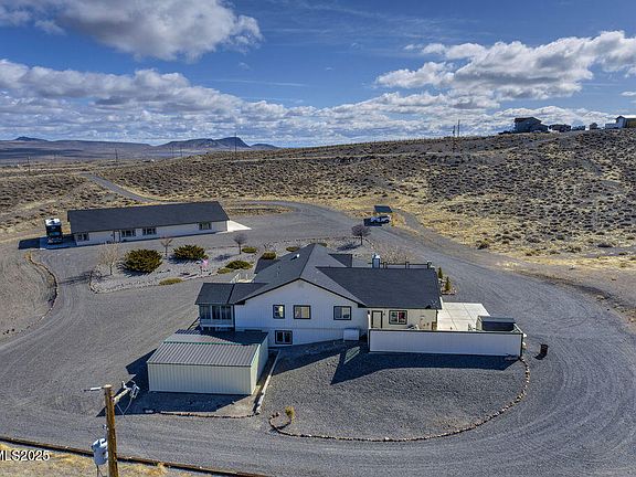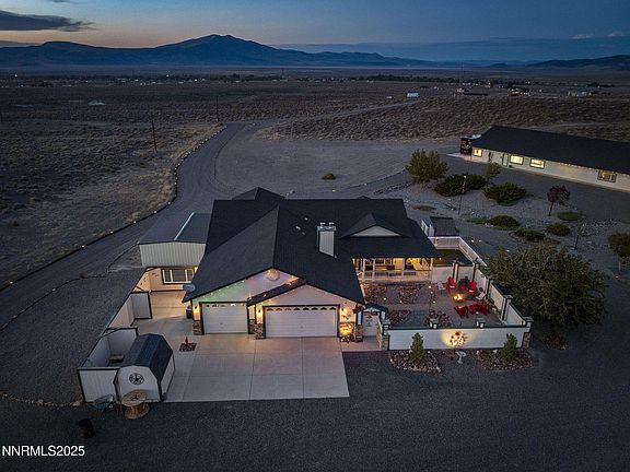 Spacious 4,600 Sq Ft Home with Massive 5,000 Sq Ft Shop sits on 20 acres, 2 parcels in East Fernley. A Rare Gem! This incredible 5-bedroom, 3bath home offers expansive living space, breathtaking views, and endless amenities all on a beautifully landscaped lot with panoramic vistas of the open desert, hills, and distant town. Inside, you'll find a spacious kitchen complete with a large island, breakfast bar, abundant cabinetry, and picturesque windows that frame the surrounding landscape. The main floor master suite features high ceilings, dual walk-in closets, double sinks, a garden tub, and private deck access to a fully enclosed, year-round spa/hot tub. The walk-out basement includes a large rec room perfect for a gym, hobbies, or play area, as well as a bedroom with a full bath, a generous storage area, and a walk-in vault. The attached 3-car garage is both heated and cooled and features a full-sized bar ideal for entertaining! Outdoor living is just as impressive, enjoy a private courtyard off the living room with a custom-built dog run and doghouse, covered patio, and an additional detached 2-car garage with extra parking space. But that's not all, just down the drive is a 5,000 sq ft finished shop built to accommodate just about anything! Featuring its own kitchen and dining area, full bathroom with tub and shower, pellet stove, perfect opportunity for multi-generational living. Also has a 12'x12' roll-up door for RV, boat, or large equipment entry. Store up to 10 vehicles with ease. Additional features include Multiple outbuildings,12'x36' covered area, Cement pads with 2 full RV hookups, large carport for equipment, Low-maintenance landscaping, truly one-of-a-kind panoramic views. This property is a dream for entertainers, car enthusiasts, hobbyists, or those looking for multi-use living and working space. Why go to the range when you can walk out your back door to your very own private 10-acre shooting range right in the backyard.. You must see it to believe it and it won't last long! Big plus is a 2.7 percent assumable VA financing if qualified.