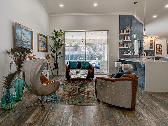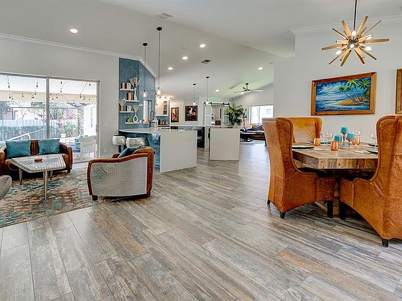 Massive custom kitchen with 2 islands, quartz counters, 5 waterfall edges, 2 sinks and all new appliances including wine fridge. Weathered wood look porcelain tile floors throughout entire home and pool deck. New bathrooms, pool heater and Tesla charger. Selling agent is the owner.