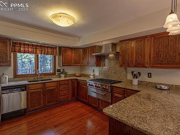 Beautiful home in desirable Woodmoor with impeccable curb appeal. Treed .86 acre lot has paved, circular driveway and backs to Tee box 11 of the exclusive Country Club at Woodmoor Golf Course. Open foyer with skylight and ledges welcomes you up to to the vaulted living room with gorgeous floor to ceiling rock fireplace. Entertain in the formal dining room which has wood floors, bright windows and leaves plenty of space for a buffet. The eat-in kitchen boasts Wolf gas range with warming drawer, double ovens, slab granite counters & backsplash, deep double sinks, 2 pantries, wood flooring and walks out to deck overlooking the golf course. Hall bath/powder room has fresh paint and newer granite top. Rounding out the main level is the spacious master suite with walk-in closet and attached 4 piece bathroom with soaking tub. Sliding doors open up to the lower level family room with additional rock fireplace, built - in shelving and cabinets and walks out to the covered, concrete patio and fenced yard. Three spacious bedrooms on lower level with updated full bathroom. Large laundry room has ample shelving and plenty of space for ironing board and folding station. Insulated garage with epoxy floor, pegboard, shelving, water spigot and workstation. Additional features include roof ice melt system above garage, electrical outlets for potential hot tub on lower patio, fenced in back yard with children's playset, and walking trails throughout the neighborhood. Easy access to I-25. Come see all this home has to offer!