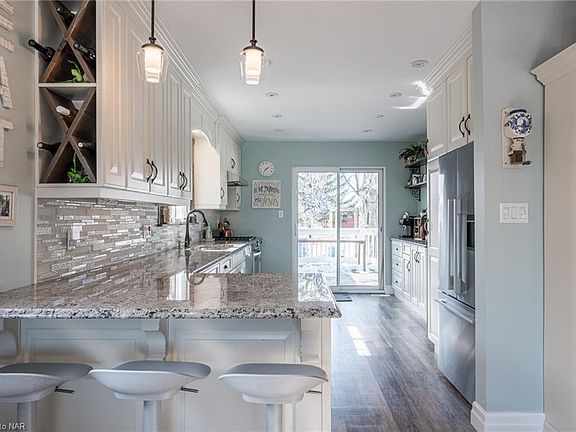 Location on point! Located at 1876 Four Mile Creek Rd., this home provides a beautiful spacious property and all the countryside charm that Niagara On The Lake is adored for, while also providing all the urban amenities of Virgil. Featuring a new front porch with a frameless glass railing makes for a clean entry into this 1250 sqft property. A bright main floor living area opens to the custom kitchen with stainless steel appliances, granite counters, and plenty of storage space. You'll love the bonuses in this kitchen!! A separate prep sink, breakfast station, and additional counter seating at the peninsula. The main level has a generously sized primary living room, a beautiful 5pc bath with granite counters and double sinks, two additional bedrooms, and a second 4pc bath finish off the main level. A separate rear entrance leads into a must-have mudroom with plenty of storage and functionality. The fully finished basement has an envious home theatre system with top of a line projector and receiver, in-ceiling speakers, and a wet bar area. Two guest bedrooms and a 3pc bath finish the lower level. The backyard is perfect for a home gathering with your favourite people, newly finished pavers, and a walkway to a fire pit and pergola. A detached garage with a clubhouse offers endless fun for a family. Tour this property today!