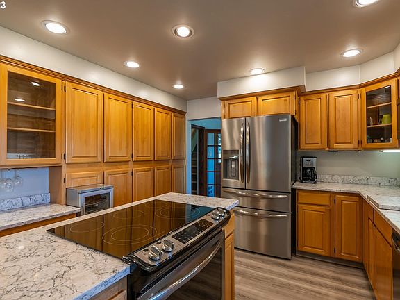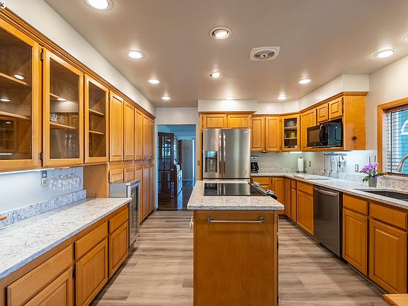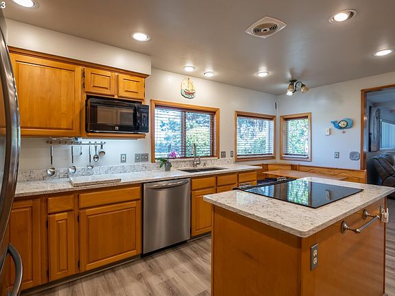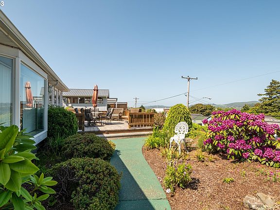 Watch beautiful sunrises with stunning views of the bay and bridge. Wonderful landscaping surrounds this home with a modern updated kitchen with wine cooler. Centrally located in North Bend and sits on 0.6 acres of land. The inside boasts beautiful hardwoods, a natural gas fireplace, and a big kitchen for entertaining. It was built in 1954 and has many upgrades, such as skylights, covered grill area and a security system. The attic is furnished and provides additional living space. The space is unique, as it featured in in town location that is surrounded by a lovely garden and lots of privacy. The outside features a covered patio, a workshop, a greenhouse, and a newly redone deck. Make this house your home!