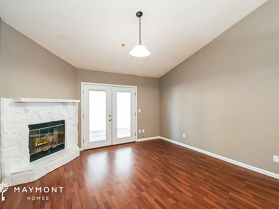 The living area offers vaulted ceilings and a distinctive white stone accent around a warm focal point. French doors let in soft daylight and open to the backyard, offering seamless indoor-to-outdoor enjoyment. The kitchen includes stainless steel appliances, ample cabinetry, and a layout that connects easily to the dining and living areas, making everyday routines smooth and convenient.