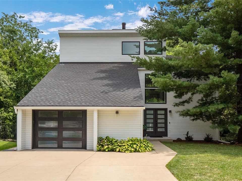 Welcome to Holiday shores main lake waterfront home! This 5 bedroom 3 bath house sits on 3 lots which includes a detached 3 car garage, fenced in yard and dock tucked away on the main lake of Holiday Shores. This contemporary home features a kitchen with a massive new island, plenty of natural light and plenty of privacy as you back to trees. Living room with high vaulted ceilings, a wood fireplace & an open concept with the kitchen. Out back a path takes you to 103 ft. of waterfront with a trex dock 72 x 11. Nice area for a picnic, a swim with a view of the lake. 3 out of the 5 bedrooms have ensuites & all have their own deck or patio, and a hot tub that is included. Kitchen features quartz counters, new cabinets, stainless appliances, and a convection oven with air fryer. Walkout basement features a family room, 2 bedrooms, bath & laundry. Attached single car garage with a work room. Move fast or you will miss out! Additional Rooms: Mud Room