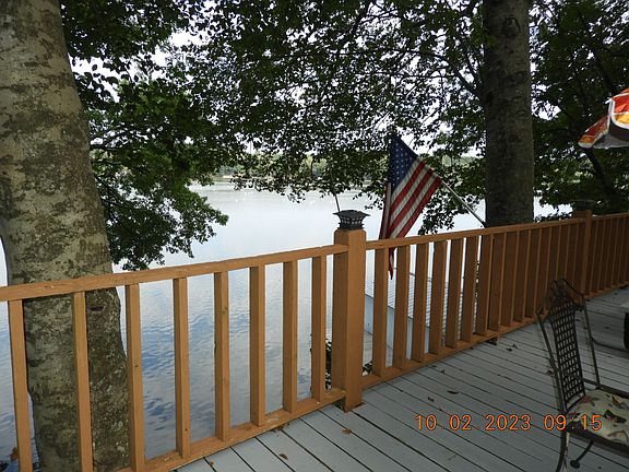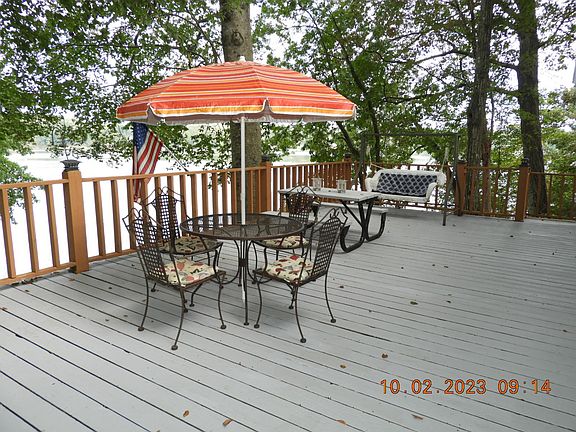 Peaceful....Come set on this 16 x 16 Deck over looking the River watching the Geese, Ducks, Birds, Boats...This home is adorable..2 bedrooms, nice size living room, metal roof...Also included is a 32 x 28 Boatshed with electric lift for your Boat..Concrete steps down to the River / Dock / Boatshed.. Beautiful trees all around...Must see...