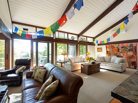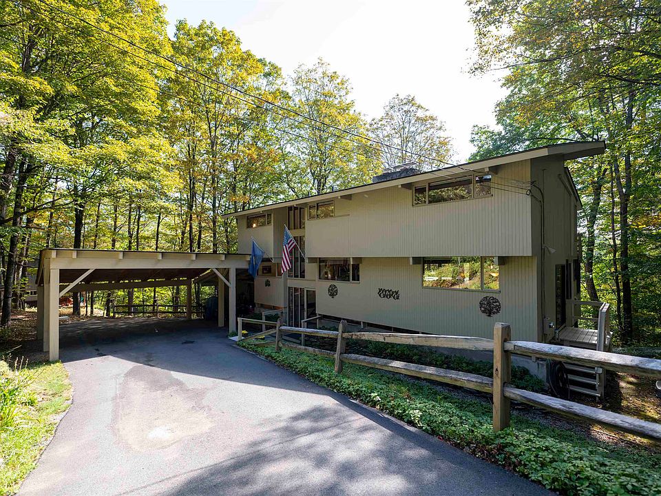 Stunning Deck House perfectly designed for light, views, and easy Vermont living. Soaring floor-to-ceiling glass in the entryway and stairwell connects all levels and creates a warm, treehouse-like feel, drenched in natural light. Honey-colored hardwood floors warm the main level, while wall-to-wall carpet and tile finish the rest of the spaces. The main level also features a striking stone fireplace, the architectural centerpiece of the expansive living room, complemented by a cozy propane stove and an intimate den with an electric fireplace. Step onto the deck, where new Pella sliders capture a framed summer view and expansive seasonal vistas, with a hot tub for year-round enjoyment. The primary suite includes a shower and peaceful outlook, while the superior guest suite showcases floor-to-ceiling glass, an en suite shower, and sunrise views. The lower level offers two spacious bedrooms sharing a double-vanity bath; ideal for family or guests. Thoughtful upgrades include a tidy laundry area, paved drive, and a large carport with space for two+ vehicles. Set at the top of Willard Road, this home embraces its natural setting with timeless use of wood and stone. With four bedrooms, three and one-half baths, and seamless indoor-outdoor living, it balances architectural beauty with everyday function; a fun, easy home to own and enjoy.