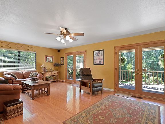 Back on the market, all inspections complete and appraisal met value. Dream home in the hills!! This home and property have been incredibly well maintained and meticulously planned out for over 20 years. This gorgeous house features 3 bedrooms and 3 bathrooms with a fully developed downstairs basement that features a guest room,gym,bathroom and another bonus room with separate french door entry. Main floor has hard wood oak flooring throughout the home with several sets of french doors that lead out to a covered wrap around deck with a private personal spa. The kitchen is nicely designed with granite countertops and tile backsplash, stainless steel appliances, gas cook top that all stay with the home, and a very large laundry/utility room with separate freezer, refrigerator,cabinets,industrial sink for any type of hobby or kitchen overflow you may need. There is a fantastic large office room that is ideal for a live and work at home environment, and office furniture stays too. So the home is fabulous and the outdoor entertainment areas are spectacular with a pool,covered patio, built in outdoor kitchen, green house, several sheds for patio furniture, wood storage, etc. There is a 2 car attached and finished garage, And a 30 x 40 drive thru shop. Road is paved all the way to the home, mature fruit trees, lovely landscaping, manicured lawn, stone landscaped walls,fenced and cross fenced pasture with pines,cedars and redwood trees as a back drop. Home has an automatic generator