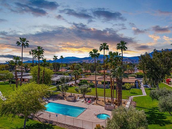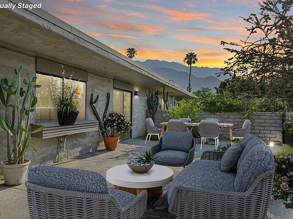 Live the Palm Springs Dream at Sagewood - Truly Exceptional Value. Discover the perfect blend of style, comfort, and outdoor living in this Donald Wexler-designed mid-century condo at Sagewood -- a community of just 108 residences thoughtfully spread across nearly 19 acres, making it one of the lowest-density HOA communities in Palm Springs. This 1,248 sq. ft. end-unit is more than a home -- it's a lifestyle, and it's priced to deliver exceptional value in today's market. Wake up to mountain views, enjoy your morning coffee on a private patio shaded by Australian Mallee trees, and step into a community designed for relaxation and connection. With direct patio access from every room, this rare pinwheel floor plan makes indoor-outdoor living effortless. Sagewood's sweeping greenbelts, mature desert landscaping, and vibrant gardens create a serene, park-like setting -- yet you're just minutes from downtown Palm Springs, world-class dining, and desert events. Inside, you'll find 2 bedrooms, 2 baths, and a flexible bonus room perfect for a third bedroom, office, or media lounge. Original walnut veneer cabinetry, timeless tile flooring, and a recently installed new HVAC system combine vintage character with modern comfort. Spend your days lounging by one of three sparkling pools, meeting neighbors for a game of pickleball or tennis, or hosting sunset gatherings on your patio under the desert sky. Sagewood is actively seeking historic designation, which could mean future Mills Act tax savings for homeowners. Whether you're looking for a weekend escape or full-time desert retreat, this home offers the best of Palm Springs living -- a true value that's ready to sell. Images virtually staged for inspiration.