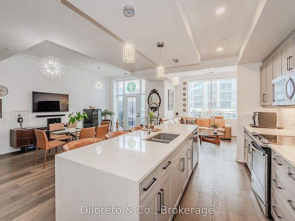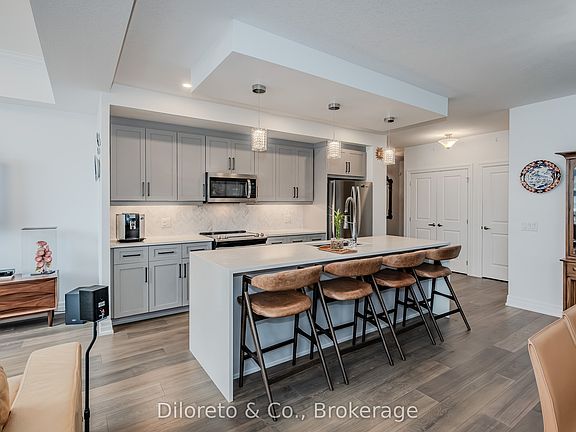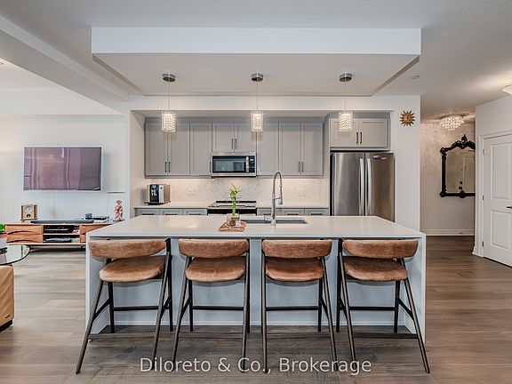 Luxury Living at 105-1878 Gordon Street! A sophisticated 2-storey condo townhouse in the heart of Guelphs sought-after south end, a rare find in this building! Offering a perfect blend of elegance and modern convenience, this exceptional residence provides an upscale living experience with access to top-tier amenities and prime location close to everything you need. Step inside to discover a spacious and stylish layout, thoughtfully designed to maximize comfort and functionality. The contemporary kitchen boasts high-end finishes, premium stainless appliances, an oversized waterfall kitchen island and plenty of storage space - flowing seamlessly into the open-concept living and dining area, perfect for entertaining or relaxing after a long day. Expansive windows bring in an abundance of natural light, while high ceilings enhance the luxurious feel of the space. A 2pc bathroom and walkout to the front porch complete the main level. The second floor offers 2 well-appointed bedrooms and main 4pc bathroom, the serene primary suite offering generous closet space, a spa-like ensuite and walkout to a private balcony. Every detail of this home has been carefully curated to provide a refined yet welcoming atmosphere. Beyond your front door, this prestigious building offers an array of impressive amenities, including a state-of-the-art golf simulator, a guest suite for visitors, a 13th floor amenity room with breathtaking views, and a fully equipped fitness centre. Residents can also enjoy social lounges and beautifully maintained common areas, elevating the everyday living experience. Additional bonuses include underground parking and storage locker. Located just minutes from shopping, dining, parks, and major highways, this condo offers the perfect balance of convenience and luxury. Whether you're a professional, young couple, or someone looking for a high-end lifestyle, this remarkable suite is a rare purchasing opportunity!!