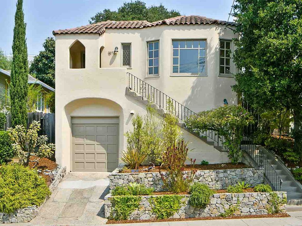 This 2BR/1BA Oakmore Spanish bungalow is perched on a sunny knoll for maximum privacy and light! The main living level offers a spacious, open-plan living room/dining room featuring walls of windows, a graceful archway, matchstick hardwood floors, a charming fireplace, and rich architectural detail. The sunny kitchen features stainless steel appliances, white cabinets, and a cozy eat-in area. The kitchen opens onto a private backyard retreat with a large, sunny deck and stone patio, and a gently sloped lawn surrounded by fruit trees (lemon, lime, apple) and shaded by an old oak tree. Lower-level finished bonus space has many potential uses, including family room and office. The adjacent garage has been converted to additional bonus space, perfect for working out, hobbies, or storage. On-street parking is abundant and easy! Just a short walk to Rocky's Market, Dimond Canyon Park and hiking trails. Close to Glenview, Dimond and Montclair shops and restaurants and Joaquin Miller Park!