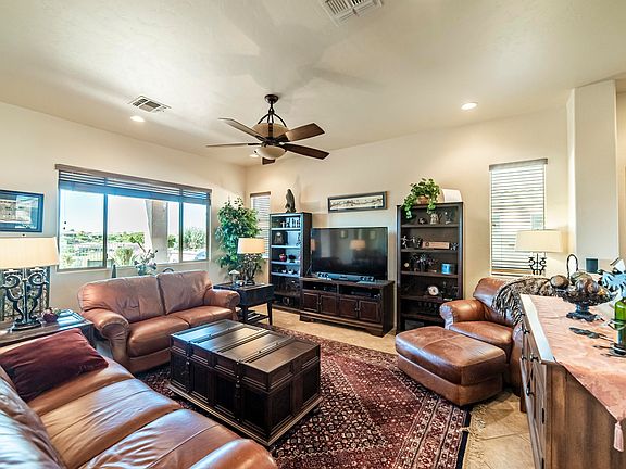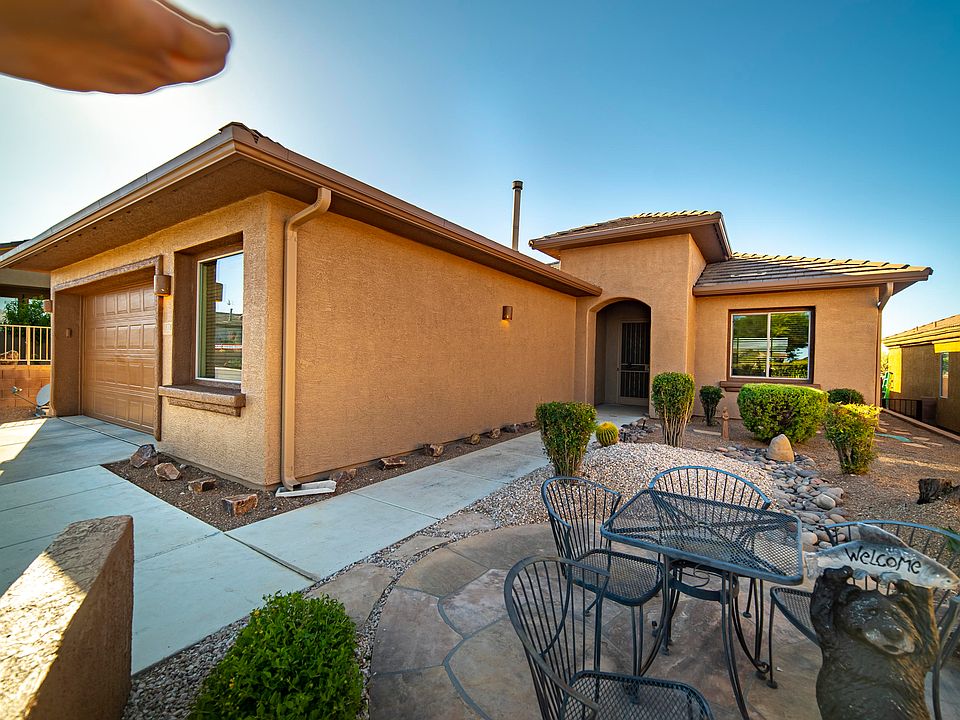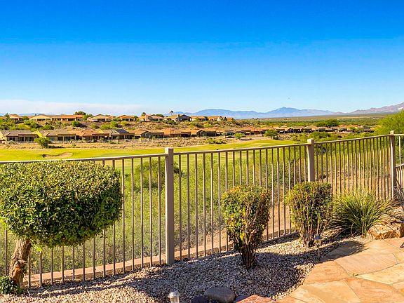 Meander up the walkway and pause to notice the flagstone patio which provides great views of the Santa Rita Mountains to the southeast. Enter through the front door to find sweeping archways and 10 foot ceilings adding character and feeling of spaciousness. The open-space den will be the perfect place to keep current with your computer work while still enjoy conversation with others in the next room. The great room is blanketed in warm desert tone floor tile pointing diagonally toward magnificent back yard views. The kitchen has abundant cabinetry, under-cabinet lighting, pull out drawers, stainless appliances, and a serving island for quick meals and entertaining. You'll enjoy dining with views of wide open spaces high above the Canoa Ranch Golf Course. Your master suite has a patio access door and the luxurious bath features separate "His and Hers" vanities and a built-in makeup station. At the end of the day, relax on your oversized covered patio or enjoy your favorite drink on the Flagstone patio with its built-in stone benches for gazing over endless green fairways set to a mountain backdrop.