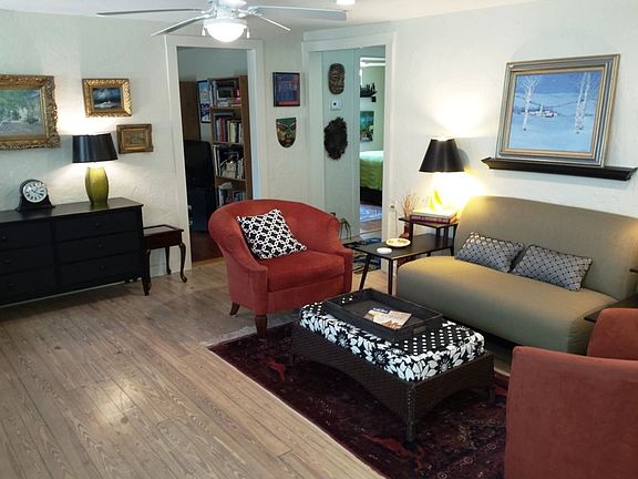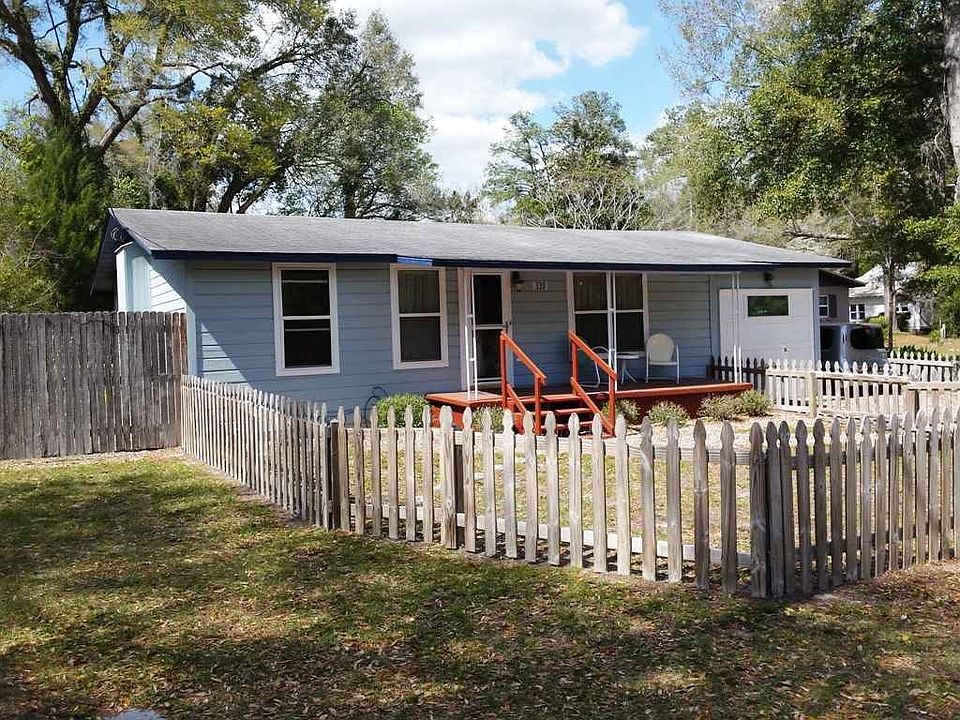Located in the heart of the High Springs historic district, four blocks from the downtown business district, this comfy cottage has been exceptionally well cared for by the current owner since 2006. Exterior features include a covered concrete front porch, and a screened back porch overlooking a spacious privacy-fenced back yard with a storage building. Inside are original wood floors, renovated kitchen and bath, a former carport now den/home office, and a TV/reading room off the living room. The kitchen window overlooks the back yard, and the living room has a large picture window view of the picket-fenced front yard. The view from the screened porch includes huge old oaks in the very back, a tall holly, and a fig tree and crape myrtle. Lots of room for the pooch to run around. HVAC is new (3 months), and there's a wall-mounted gas heater in the den and a tankless gas water heating system. The driveway is graveled and has a side entry door to the den (former carport). Attention to detail is evident in every room. Maintenance has been a priority. Everything one would need for daily living is within walking distance or a short drive.