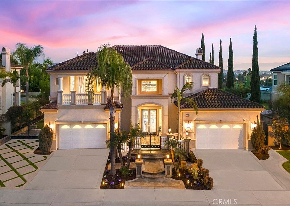 Nestled in the prestigious Del Mar community of Yorba Linda, known as the hometown of President Nixon, this immaculate Toll Brothers estate epitomizes luxury living at its finest. As you step through the elegant formal entryway, you are greeted by soaring vaulted ceilings and double sweeping staircases, creating a grand and inviting atmosphere.