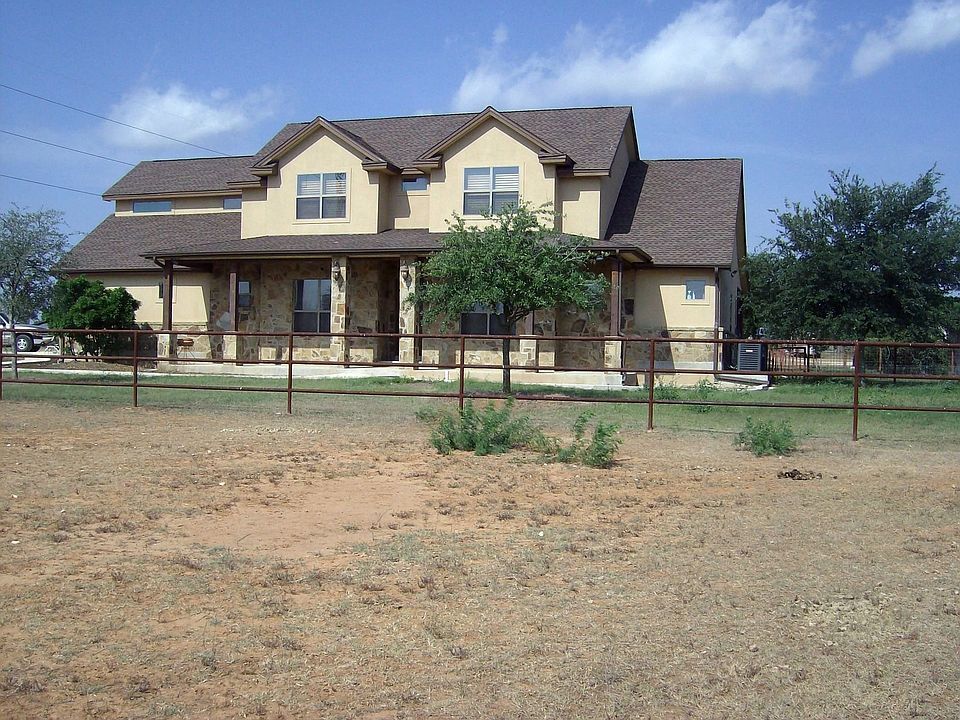 Gorgeous custom-built home on 2.6 acres, with beautiful custom tile, stone, and woodwork throughout. 3600+ square feet, 5BR/2.5 baths, high ceilings, tile and wood floors, huge granite counters, up-graded appliances, walk in pantry, and huge floor-to-ceiling stone gas fireplace in living room. Master bath has Jacuzzi tub, double sinks, walk-in shower with dual heads, and seperate his & her walk-in closets. Private office area downstairs, bonus game/theatre room upstairs, large covered front & rear porches, seperate covered patio area for entertaining with a fireplace & ceiling fan, 760sq-ft attached garage with "Texas Basement", and large barn with electricity & 5 horse stalls. Quiet, country living, with easy access to IH-35 and only 20 minutes to downtown San Antonio and Lackland AFB.