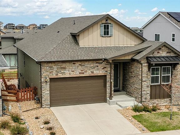 Step into this sophisticated ranch-style home, complete with a lower-level walk-out design and a hospitable reception! Nestled in the coveted Candelas neighborhood of Arvada, this beautiful property is conveniently located near community amenities, schools, trails, parks, and protected open spaces. With a highly functional, open layout and carefully handpicked design center upgrades, the main floor provides the perfect space for living and entertaining. Upon entering, you will be met with ten-foot ceilings spanning the entirety of the interior. The main living area boasts LVT flooring, seamlessly transitioning between a spacious family room, a formal dining area, and a well-equipped kitchen complete with a large walk-in pantry. The private deck is easily accessible, providing added opportunities for hosting or taking in the stunning Colorado sunset views. Enjoy the benefits of the main floor primary suite, featuring an en-suite bathroom complete with five-piece amenities, dual sinks, and a generously-sized walk-in closet that includes convenient built-in shelving. Alongside the primary suite, there are two additional bedrooms that share a full bathroom, a well-stocked laundry room complete storage space and a handy utility sink, plus a mudroom with a half bath conveniently situated just off the interior garage access. The moment you step down to the expansive lower level, you'll be amazed by the potential for creating more living space. From additional bedrooms to customizations that reflect your personal style, this level is a blank canvas awaiting personal touches. The home is completed by its oversized attached three-car garage, featuring lofty 15-foot-high ceilings, and custom overhead storage, and provides convenient access to Golden, Boulder, the I-70 corridor, and a quick 40-minute commute to DIA. This fantastic property provides the perfect space and location for enjoying Colorado to its fullest! Contact Jana Schmidt today to schedule a private tour!