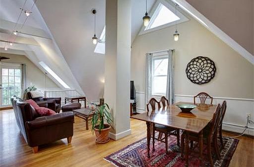 Rare opportunity to own a two bedroom Victorian penthouse condo in a great JP neighborhood, only seconds from the Stony Brook T stop and with its own DEEDED GARAGE! This spacious home offers hardwood floors, cathedral ceilings with exposed beams, 9 skylights and an open layout perfect for entertaining! Gorgeous French doors lead to an outside balcony with treelined views of the back courtyard area. Kitchen has large granite counters, granite tile, porcelain sink with disposal and new stainless steel appliances. This top-level unit also features two large bedrooms, an updated bathroom and beautiful lighting fixtures throughout. Other amenities include new in-unit laundry, ample storage space and a loft suitable for a private reading area, or additional storage. Located minutes from shops and restaurants and Bike Score of 91 are all added bonuses to this gorgeous sun-filled condo!