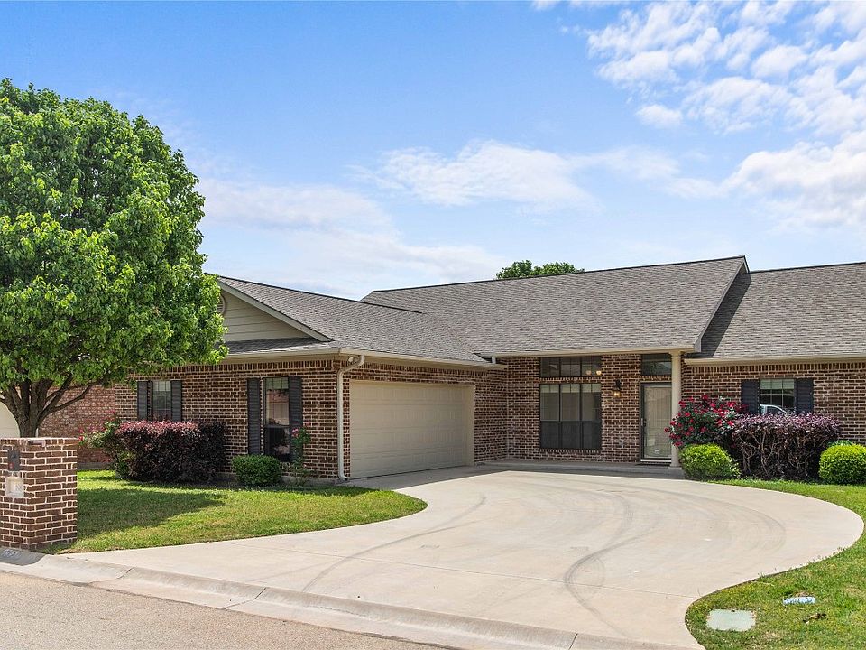 Retire and enjoy small-town, maintenance-free living in Ridgewood Gardens, Early, Texas. $7,000 flooring allowance with acceptable offer. Three bedrooms, two baths, formal dining and spacious living area with vaulted ceiling. Security and sprinkler systems. En suite primary bedroom with separate his-and-hers bath vanities, tiled handicap-accessible shower, grab bars, walk-in closet and built-in linen cabinet. Ceiling fans. Roomy kitchen with breakfast nook, granite tops, under-counter lighting, walk-in pantry, pull-out shelving, stainless electric range, built-in microwave, dishwasher, disposal and French-Door refrigerator with in-door icemaker and water dispenser. Huge utility room with sink, washer-dryer, broom closet and wall-mounted ironing board. Two-car insulated garage with electric garage door, two storage closets and doggie door to backyard. Fenced backyard. $175 monthly fee covers yard watering, mowing, pest control, HVAC service. Seller is licensed Texas real estate broker.