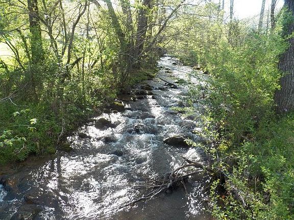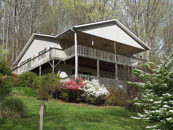 Large home set up perfect for the setting. Two porches extend the back of the home overlooking Allison Creek (on this property), neighboring private pond, valley & mountain views. Open floor plan w/ breakfast bar/island in Kitchen w/ huge pantry off to side, vaulted ceilings, stone rock wood-stove fireplace, 2bd/2ba split bedrooms on main and then 1bd/1ba w/ walk-in closet below. Plenty of unfinished basement space for workshop or future expansion including level entry to both levels.