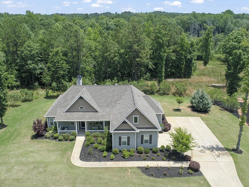 Welcome to this stunning custom-built ranch home, situated on six private acres and meticulously maintained by its original owner. This residence features custom landscaping and a 9-zone sprinkler system, ensuring the grounds are always lush and green. With a comprehensive security alarm system, you can enjoy peace of mind in this serene setting. The Larkspur floor plan offers approx. 2500 square feet of luxurious living space, designed with numerous upgrades throughout. The home is fully electric and boasts a 4-ton A/C unit for the main level and a 2-ton A/C unit for the upper level, ensuring comfort year-round. The interior has two master bedrooms on the main level, each with walk-in closets, as well as an additional bedroom upstairs. Custom blinds and shutters adorn the windows, while granite countertops and tile backsplashes add elegance to the two full-tile baths and one-half bath. The kitchen, the heart of the home, features a pantry, double built-in trash containers, and a massive island for maximum counter space and additional seating. The spacious great room includes a custom stone gas log fireplace, perfect for cozy evenings. Adjacent to the Great Room is a separate dining room and a breakfast room, providing ample space for entertaining and family meals or use as an office for a quiet space for work or study. Two sunrooms and a back patio overlook the private backyard, creating perfect spots for relaxation and enjoying the outdoors. The home is finished with waterproof engineered flooring throughout the main living areas and carpet in the bedrooms. Don't miss the opportunity to call this your home!