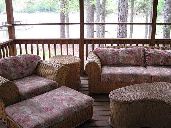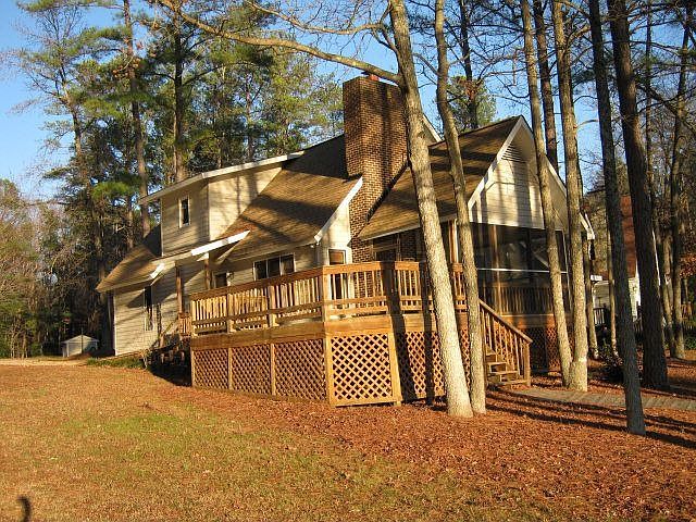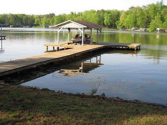 Magnificent lot on Lyons Creek, just around the corner from main lake with 166' of shore line. Tranquil setting on this level private lot. Solid, site built home with kitchen, living and eating area enjoying that gorgeous view. 2 bedrooms and laundry room on the main floor with spacious master with loft and walk-in closet on 2nd. Full baths on each floor and brick wood burning fire place in living room. Lots of storage closets, pantry and attic. Large screened porch, spacious deck and single boat house. County water hooked up, but still has functioning well for outdoor use.