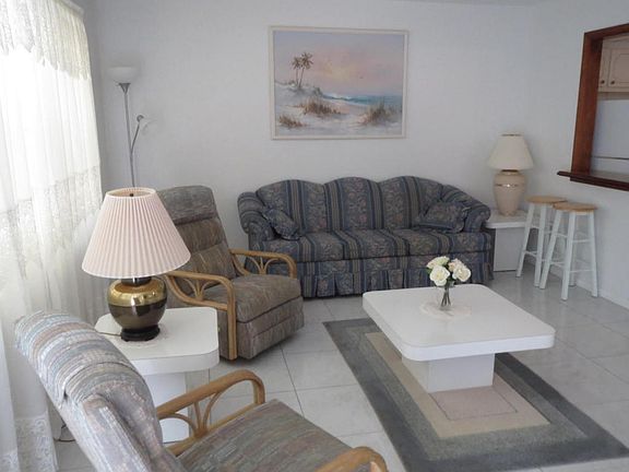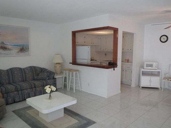 Adorable 1 bedroom, 1 1/2 bath condo in a great convenient location. Totally furnished with everything you need for comfortable South Florida living. Large living/dining room. Kitchen is large. Screened in patio. This is a very active 55+ adult community that has almost constant activities. The convenient location is close to shopping, restaurants and the turnpike.