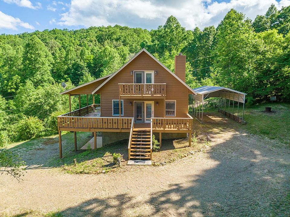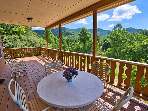 Mountain Chalet with the Long Range Views you've been searching for! 1.99 Acres of Usable, Rolling Meadows with a Babbling Stream on the lower portion. Get ready for Outdoor Living with Two Covered Porches, Large Deck, Private Viewing Deck off Primary BR and Firepit Area. Well designed home has Guest Bedroom on Main, Full Bath, Laundry Facility, Living/Dining/Kitchen Areas all Open. Wood Burning Stove. Upper Level: Primary Bedroom, second Guest Bedroom, 2 Walk In Closets and Full Bath. Lower Level: Second Living Area, Bonus Rm. for sleeping, Full Bath + Oversized 1 Car Garage. Move right in --- Most Furniture in home conveys. Two Level Outbuilding 32' X 26' w/Power & Water comprised of Main Level - Big Workshop, Storage and a Room that could be a Studio or Office. Lower Level Oversized Garage & Equipment Storage. Tall Metal Carport for RV Storage. Two Water Heaters. Road Maintenance Agreement in the Deed, however, no funds have ever been collected. 2022 New Exterior Paint and Garage Roof. Two Tractors can be purchased. Would make a great Primary Residence, 2nd Home or Vacation Rental. Easy Access, 12 minutes from downtown Franklin.
