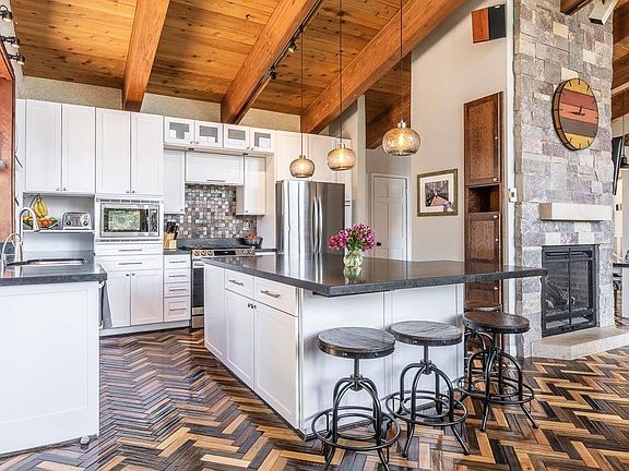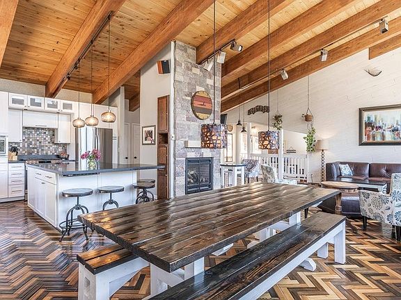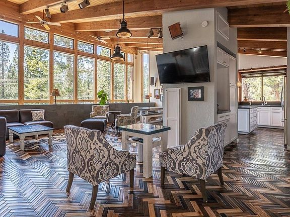 This is a quintessential Mammoth Lakes family home that sits up high on a wooded lot, bordering the national forest, with all-day sun and stunning views of the mountains. At 2,514 sq ft, and with 3 first-floor bedrooms (with an extra little den) and 2.5 bathrooms, this home offers spacious mountain-modern living. The structure maximizes the natural warmth of the sun, with the entire front facade of the home lined with grand floor-to-ceiling windows. This "solar wall" was constructed in such a way to provide full-sun exposure during the winter months, while the roofline provides a sunshade respite during the summer months. With extra workspaces, a two-car garage, and plentiful storage areas, all the cars, and Mammoth toys can be easily stored throughout the year. Extensively upgraded and re-modeled by the current owner throughout, you can feel the love and attention that has been invested into this property. After a long day on the slopes cozy up and enjoy the wood-stove warmth, propane-fireplace ambiance, and/or the private jacuzzi located just off the master. The expansive great room on the uppermost floor that houses the kitchen, dining, and living rooms offers custom hand-laid red and white oak flooring in an exquisite and dramatic herringbone pattern. With high vaulted ceilings and an open-concept floorplan, this space is perfect for entertaining in the winter and summer months. During the warmer months, enjoy al-fresco dining and BBQ-ing just off of the kitchen, while the kids use the opposite side of the house to expend some energy on the half-pipe skate ramp. Just behind the home lays a terraced patio with perennial herb gardens and an added bonus that the kids will love... a custom-built treehouse that has some of the best sun-set Mammoth Mountain views in all of town! Bordering the national forest, this property offers backcountry skiing/snowboarding/hiking access just outside the backdoor, and is the epitome of Mammoth Lakes living. This property is being sold turn-key and fully furnished. Call/text Gillian Parrish for more information.