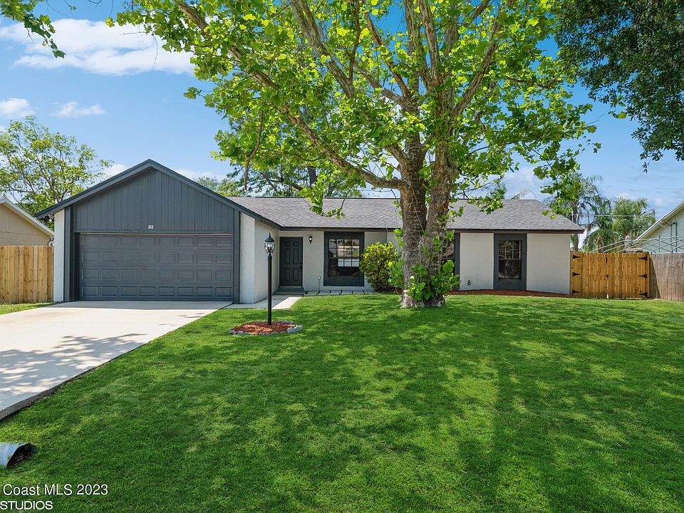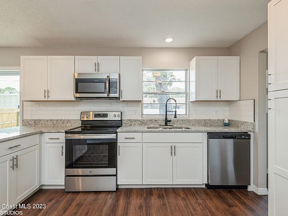 Check out this beautifully renovated 3 bedroom 2 bath home located in a quiet community in Palm Bay, close to major roadways, shopping, medical facilities and restaurants. Home has new roof, new HVAC, new kitchen cabinets with new stainless steel appliances, granite counters and all new fixtures. Guest bath and primary bath completely redone with new tub, shower, vanities, fixtures, faucets, commodes etc. New luxury vinyl planked flooring located throughout home. New front door, sliding door and all new interior doors. Interior and exterior of home freshly painted. Electrical panel updated and home has new sewer line. This home won't disappoint.