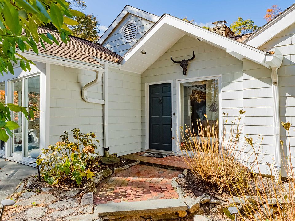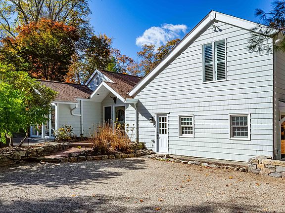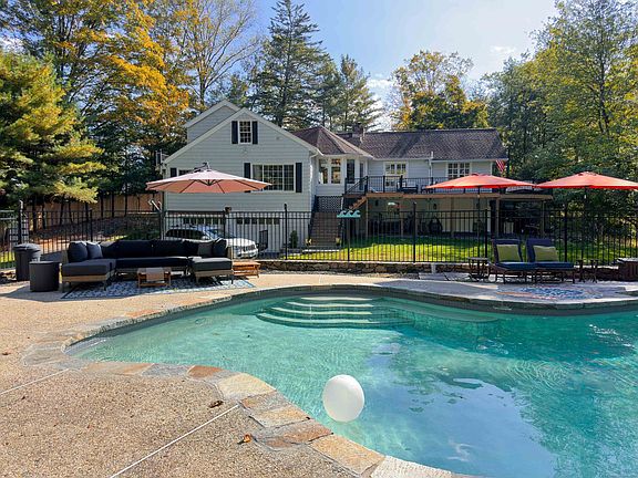 Escape to quaint Weston Connecticut // 188 Godfrey is a wonderful blend of entertaining and everyday comfort. It's also something different, in the best way. Magical ingredients include: vaulted ceilings in all the main spaces, a wrap around elevated deck with treetop views, multiple bluestone patios, walls of glass that bring the outside in. The main level Living Room features a native stone fireplace, a seating area plus room for a formal dining table if desired. French doors lead to the elevated deck & outdoor seating. The Den/Sunroom has a cocktail bar, remote shades, tile floor and it leads to the front stone patio. The Eat-In Kitchen has bright skylights, a cooktop, double ovens, granite counters, dishwasher, french door fridge plus a casual eating area. Take a few steps down to the Family room which offers 20+ ft ceilings, built in book and display shelves, and a reading nook. This level also has a guest bedroom suite, a full hall bath and two additional bedrooms. There is a private side entrance with a coat bench and a coffee bar. The stairs up take you to the primary suite level. The bedroom has vaulted ceilings and skylights, two spacious walk-in closets and a relaxing full bath with a private balcony, step-in shower and deep corner tub. Completing this woodsy sanctuary the outdoor amenities include a heated in-ground swimming pool and a hardscape with a stone fireplace and multiple seating and lounging areas. The photos include a detailed floor plan for reference. One acre corner lot with ample parking & wrap around driveway. Attached 2 car garage under. Pet friendly. Up to 2 pets considered on a case by case basis with additional monthly pet fee. Invisible Fence installed - tenant supply their own collars. Newer central heat & air conditioning system, windows/slider on lower level guest rooms, backup generator, full sized ice maker and bar. Freshly painted inside and out. Available for occupancy early 2026.
