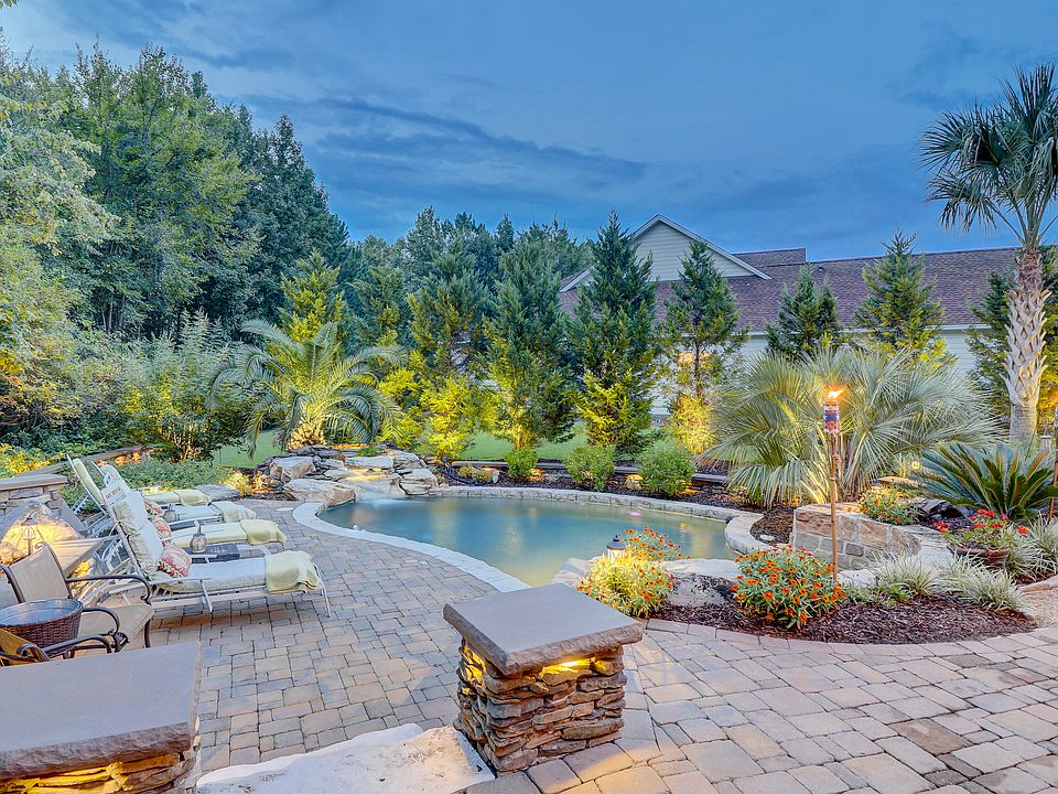 Beautiful luxury home. 3 bedrooms/3 baths, dining room, home office, large well appointed kitchen, double oven, gas range, granite countertops, and stainless steel appliances. Living room with gas fireplace, custom bookcases, 2 car garage plus golf cart garage with custom storage, telescoping sliding doors open to a screened in porch with private nature views. Large master suite with walk in closet, separate tiled shower and jetted tub. Outdoor pool with tropical waterfall and plantings. Custom built covered grilling area and bar. Professionally landscaped with accent lighting and gas fire pit. Located on a private cul de sac in Hampton Hall.