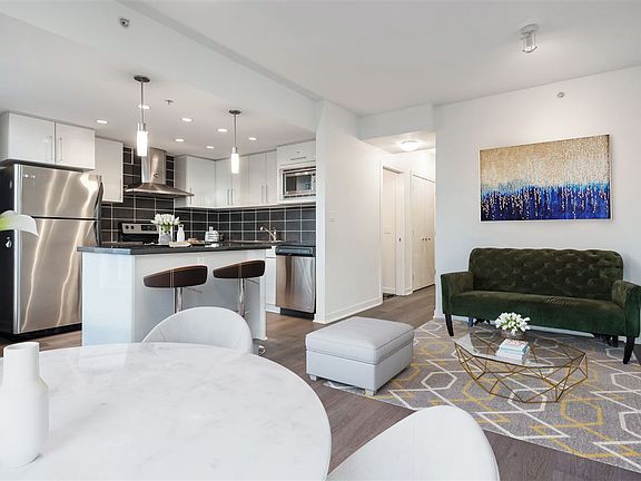 Bright corner unit with Mountain & City views at Spana! This spacious 2 bedroom + Den home offers: 2 full baths, an open kitchen concept with granite counters, stainless steel appliances & wine cooler, laminated floors throughout, roller blinds, built in closets, and in suite laundry. Superb amenities including: concierge, swimming pool, sauna, hot tub, gym, 3 party rooms, and theater. One parking stall, one storage locker, and one bike locker. Two pets & rentals allowed including Airbnb. Bonus: heat & hot water included in your maintenance fees! Steps to Skytrain, Costco, Rogers Arena, T&T, Gastown, and much more.
