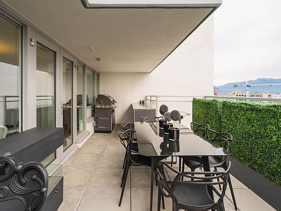 Incredible 2 level PENTHOUSE in Vancouver's historic Chinatown with stunning VIEWS. Floor to ceiling windows allow an abundance of natural light throughout this corner, SE facing unit. Main floor features powder room w/ large storage, an open concept gourmet kitchen w/ new upgraded stone counter tops, Miele appliances, gas cook-top, 2 built in side by side fridge/freezer, New full size LG Steam washer/dryer & hardwood floors. A $45,000 custom glass built in 1,000 bottle wine cellar situated in the living room makes this home an entertainers dream! Step right out onto your 380 sqft patio, BBQ & enjoy breathtaking Mountain & City views. Top floor features a large master w/ skyline views & large en-suite. Second bedroom w/ access to 104 sqft patio & ample storage. Private showings only please