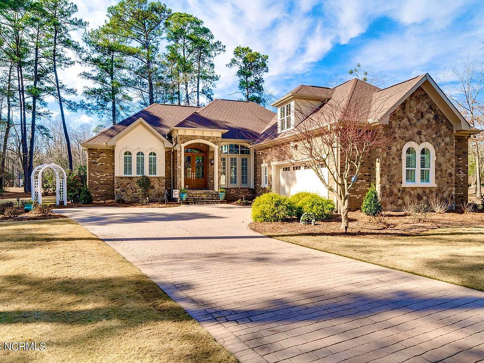 Gorgeous, custom-built home in River Landing Gated Golf Community. A lush landscape, aggregate driveway, and detailed stone exterior accentuate the home's curb appeal. Highlighting this stately residence are the private cul-de-sac location and stunning views of the pond and the award-winning Landing Golf Course. The grand double-stained wood doors begin your journey leading to this home's many architectural elements consisting of archways, high ceilings, built-in shelving, updated stained glass light fixtures, and custom drapes. The gourmet kitchen is the heart of the home featuring stainless steel appliances, a gas range, granite countertops, tons of cabinetry, a pantry, and a large island. The kitchen opens into the breakfast nook, living room, and dining room, making the open-concept floor plan ideal for formal gatherings and everyday living. Wall-to-wall windows encompass the breakfast nook bringing in plenty of natural sunlight while you enjoy a cup of coffee watching the Blue Heron fish in the pond. The Spacious living room features high ceilings, a gas fireplace, and french doors leading to the screened-in porch. The large porch has a built-in gas grill, counter space, and sink, making outdoor cooking easy. The primary suite on the home's west wing features dual vanities, a tiled walk-in shower, a soaking tub, mirrored medicine cabinets, updated fixtures, and a large walk-in closet. Two additional bedrooms, and two additional full bathrooms, are located in the east wing. Upstairs is a bonus space with a half bath, perfect for an office, gym, playroom, and 4th bedroom. Home also has a separate well for irrigation. River Landing offers a safe active community with various membership options available that include access to clubhouse, resort style pool, restaurants, fitness center, and more.