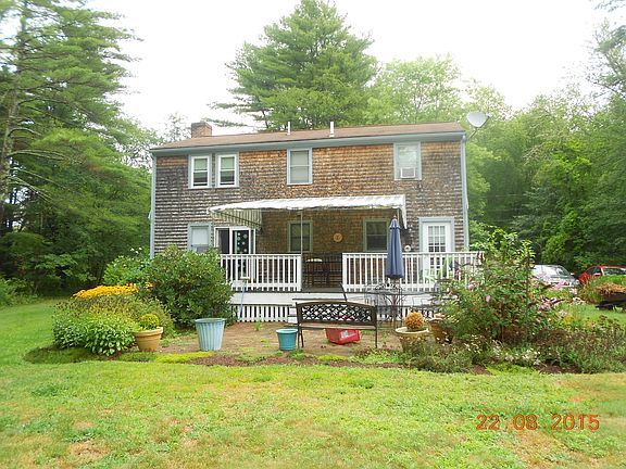 Over an acre of land on a tranquil country lot lies this cozy gambrel cape, what a great home it is with 3 bedrooms, 2 full baths, kitchen with island,(includes appliances) dining room, front to back living room with fireplace, front to back master with his and hers closets. Front entrance area has hall with huge closet. Full basement with bulkhead leading out to back yard, spacious rear deck with access from the kitchen and living room, great outdoor space with plenty of room for entertaining. Steps from deck lead down to the patio area which is surrounded by mature plantings. Perfect size yard with enough room for a garage, fire pit, vegetable garden, volley ball net, horseshoes etc. Nice size shed with plenty of storage. House contains a professionally wired transfer switch for generator hookup which is included with sale. If your looking for a great place to call home this could be it. New title V system just installed.