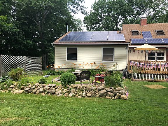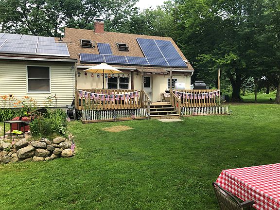 Ranch alternative, with second floor master bedroom and master bath. County style living with a Nice rustic feel w/exposed beams, stone FP with wood stove under, second wood stove in main living room, skylights upstairs and granite in kitchen. Solar and a Natural Gas generator that runs the whole house. Mechanicals in excellent condition. Over 3 acres for privacy.